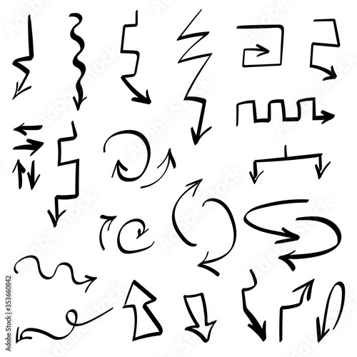 Set of arrows. Hand drawn elements. Simple vector logos. Direction indicators, pointers and scroll elements. Collection of various arrows Isolated on white background Vector illustration