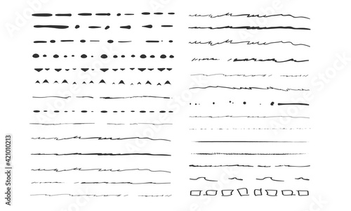 Set of artistic pen brushes.Doodles, ink brushes.Set of vector grunge brushes. Collection of strokes of markers. Set of wavy horizontal lines