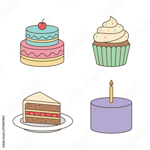 Set of assorted cartoon birthday cake, slice, and cupcake icons, symbolizing dessert and celebration.
