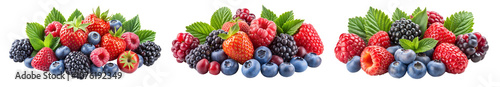 Set of assorted fresh berries (strawberries, raspberries, blackberries, blueberries) with green mint leaves. transparent PNG, cutout, or clipping path.