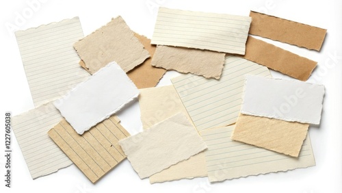 Set of assorted paper scraps in various shapes and sizes isolated on a white background, desk accessories, cutouts, stationery, notebook paper scraps