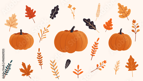 set of autumn elements, leaves, pumpkins, berries. decorations, design elements, horizontal banner