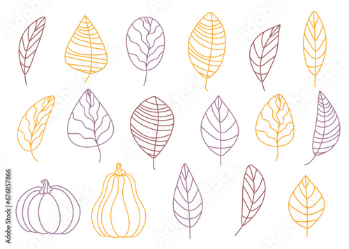 Set of autumn leaves and pumpkins. Vector illustration from outlines