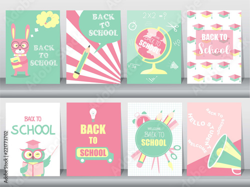 Set of Back to School card set, school kids, chalkboards, learning,animal,cool, Vector illustration.