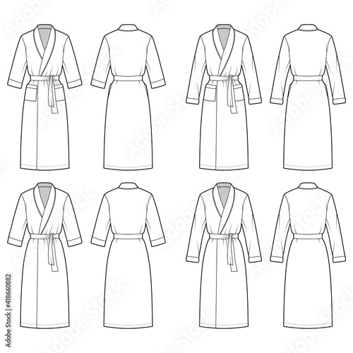 Set of Bathrobes Dressing gown technical fashion illustration with wrap opening, knee length, oversized, tie, pocket, elbow long sleeves. Flat front back white color style. Women men unisex CAD mockup