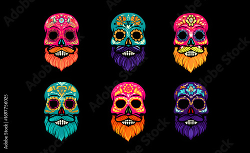 Set of bearded mexican sugar skulls with pattern. DA OF THE DEAD. Design elemet for poster, greeting car, banner, t shirt, flyer, mblem.