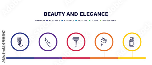 set of beauty and elegance thin line icons. beauty and elegance outline icons with infographic template. linear icons such as hair clipper, aloe vera, disposable razor, tint brush, french perfume