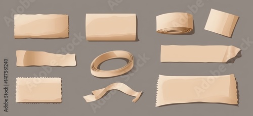 set of beige tape pieces and strips on grey background, adhesive tape mockup elements flat top view