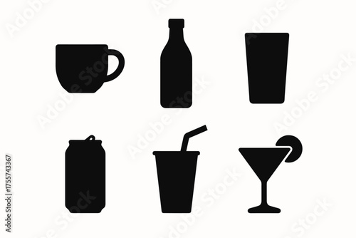 Set of beverage icons: mug, bottle, glass, can, cup, cocktail