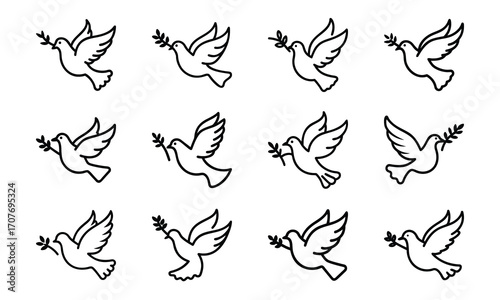 Set of bird line icons including dove, eagle, owl, parrot, peacock, and flying birds isolated on white background