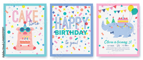 Set of Birthday greeting card with cute little pig, hippo, cakes, colorful confetti and typography design.