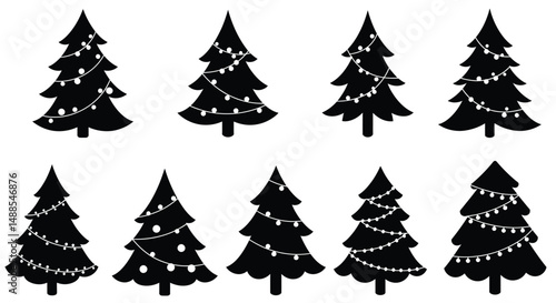 Set of Black and White Christmas Tree Silhouettes With Holiday Decorations