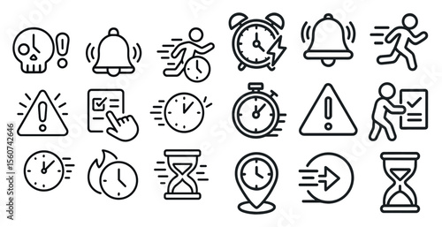 Set of black and white icons that represent different time-related concepts. The icons include a clock, a bell, a skull, a person running, and a person walking. The icons are arranged in a grid