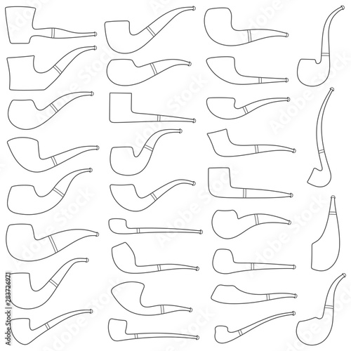Set of black and white illustrations with the image of smoking pipes of different shapes and types. Isolated vector objects on a white background.