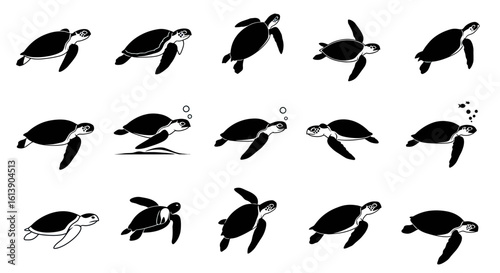 Set of Black and White Sea Turtle Vector Illustrations in Various Swimming Poses