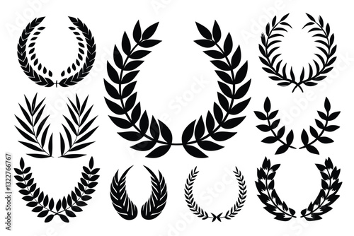 Set of black and white silhouette circular laurel foliate and wheat wreaths depicting an award achievement