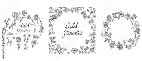Set of black and white square or round frames in contour doodle style with Wild flowers. Monochrome seasonal botanical wedding invitations isolated on white background