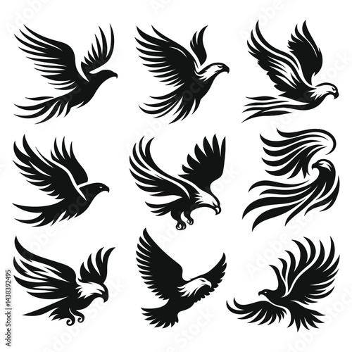 Set of black and white wing illustrations featuring birds like eagle, hawk, dove, and phoenix in a tribal and symbolic design, ideal for tattoos and representing freedom and nature
