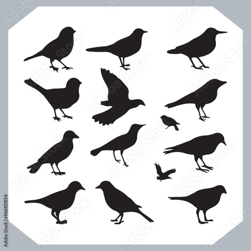 Set of black bird silhouettes and birds collection, bird set design. Eagle, Parrot, Penguin, Owl, Sparrow, Peacock, Flamingo, Hummingbird, Ostrich, Hawk.