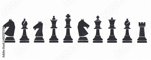 Set of black chess pieces silhouettes on white background, symbolizing strategy and intelligence in minimalist art - Generative ai