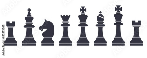 Set of black chess pieces silhouettes on white background, symbolizing strategy and intelligence in minimalist art - Generative ai