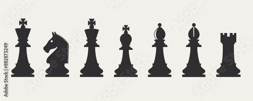 Set of black chess pieces silhouettes on white background, symbolizing strategy and intelligence in minimalist art - Generative ai