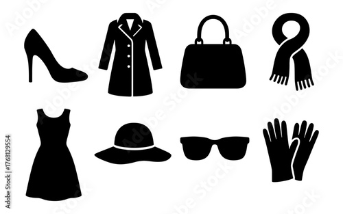 Set of black fashion and clothing icons including high heel shoe, coat, handbag, scarf, dress, hat, sunglasses, and gloves. Flat icon style