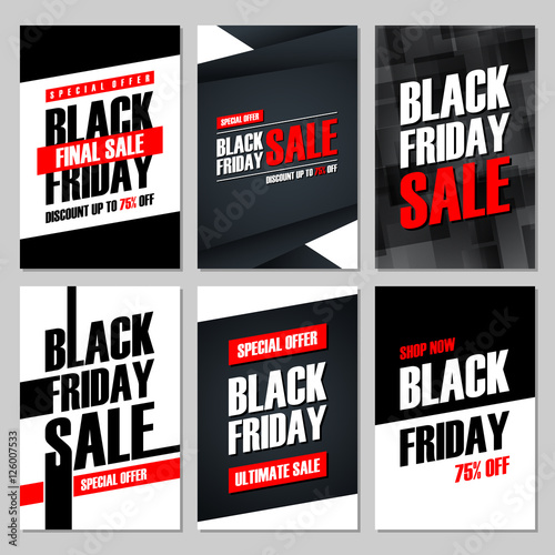 Set of Black Friday Sale banners. Special offer, discount up to 75% off, shop now, ultimate sale. Banners for business, promotion and advertising. Vector illustration.