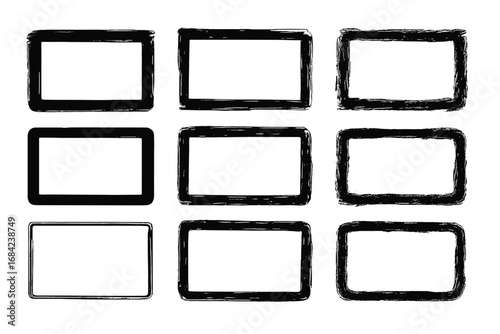 Set of black grunge frames. Hand drawn rectangle border collection. Vector ink brush stroke box. Dirty, distressed texture effect. Artistic design element for banners and text.