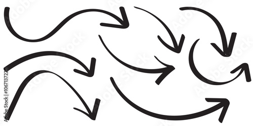 Set of black hand drawn arrow element vector. Collection of doodle arrows, lines, symbol, pointing mark, shapes on white background.