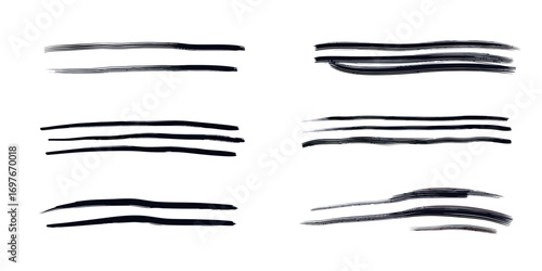 Set of black hand drawn brush stroke lines with different thicknesses and styles for underline, highlight, and accent design elements in minimalist vector format