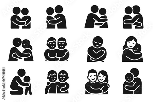 Set of black human figure icons demonstrating hugs, friendship, and affection