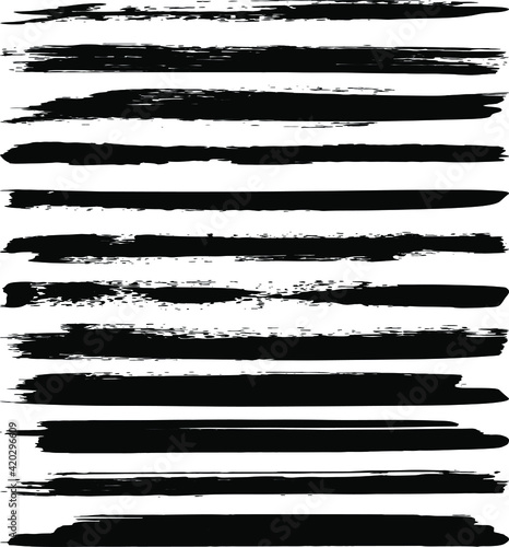 Set of black isolated grunge brush stroke. Dry paintbrush stripes collection. Distressed vector banner. Trendy textured shapes. Abstract dirty dark lines
