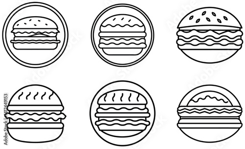 Set of Black Line Burger Icons, Minimalist Fast Food Design,