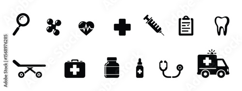 Set of black medical icons on white background. Simple flat vector healthcare symbols including hospital equipment, doctor tools and pharmacy items. Perfect for medical presentations and health apps i