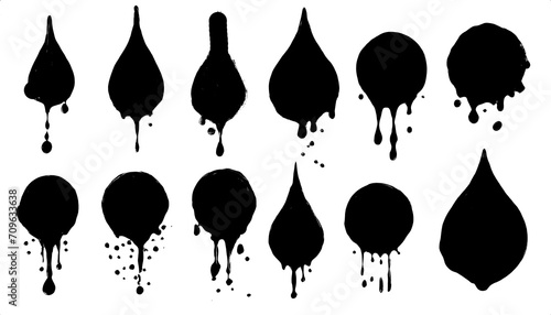 set of black paint or ink oil drops isolated on a transparent background. PNG, cutout, or clipping path.