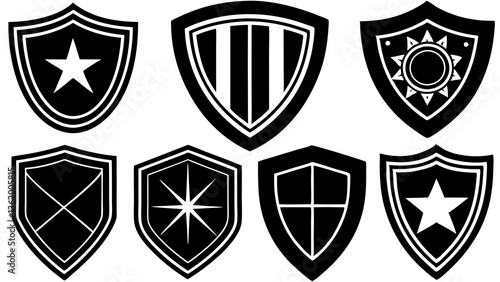 "Set of Black Shield Icons with Star Symbols – Security and Protection Emblems"