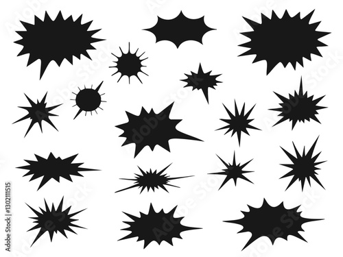 Set of black silhouette comic speech bubbles, bursts, and explosion effects with dynamic action lines
