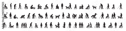 Set of black silhouettes of people with disabilities on white background. concept of accessibility, inclusion, diversity, wheelchair, cane, guide dog, community, isolated icons.