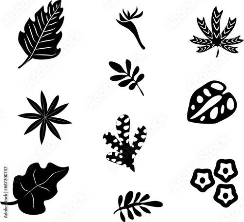 Set of black silhouettes of tropical leaves palm, trees, plants. Vector illustration