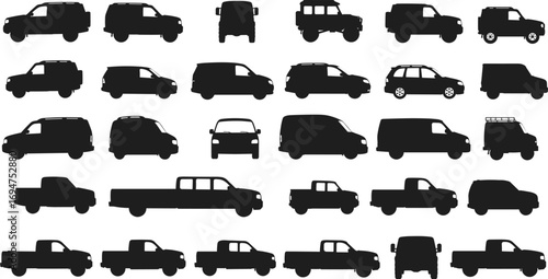 Set of Black Silhouettes of Various Vehicles including SUVs, Vans, Trucks, and Limousines, Automotive Vector Illustration