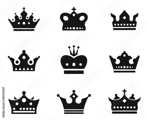 Set of black vector crowns and icon on white background. Vector Illustration. Emblem and royal symbols.