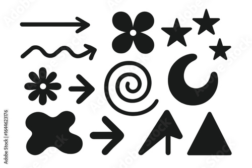 Set of black vector shapes and design elements. Collection of arrows, stars, flowers, moon, spiral and abstract icons. Modern simple minimalist silhouette graphic symbols.