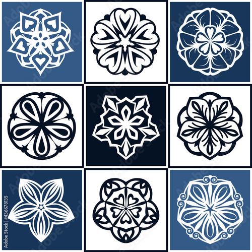 Set of blue and white mandala isolated on background. Vector decorative round ornaments. Minimal design elements flower shape of snowflake icon for logo, tattoo artwork.