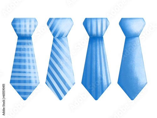 Set of blue necktie illustration. Watercolor fashion tie accessory for men. Fathers day clipart or male necktie elements.
