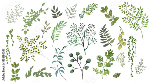 Set of botanical illustrations of herbs and twigs in green tones. Perfect for eco decor, organic design and floral compositions
