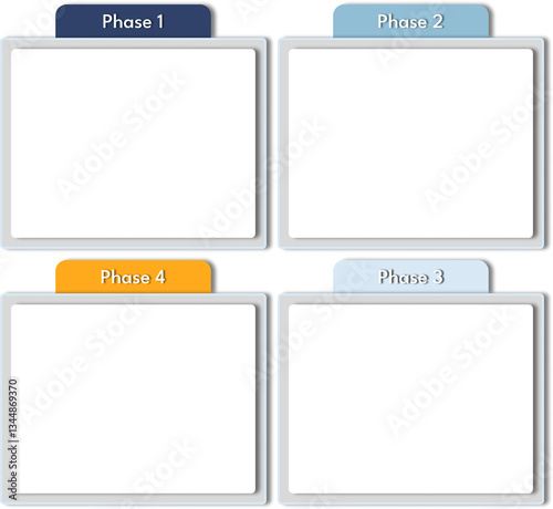 Set of boxes to organize presentation, small, colorful, blue and yellow flowchart, four phases.