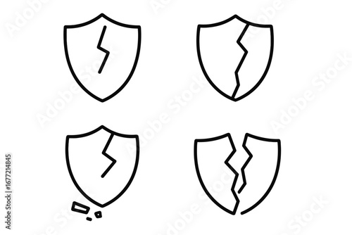 Set of Broken Shield Line Icons and Outline Signs for Graphic, Web Design, Apps, Security, Protection, Damage, Safety, Alert, Risk Concepts, Vector Cartoon Illustration