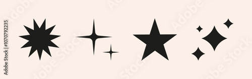 Set of burst sparkle, star, sun shape. Abstract explosion, glowing and blinking effects for festive party design. Twinkle glitter and flash graphic elements. Isolated vector illustrations.