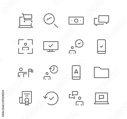 Set of business and digital marketing icons, laptop, target, chart, money, check, approve, finance, chat and linear variety vectors.